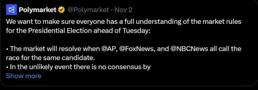 如果特朗普按照市场规则输掉选举,意味着将会有来自 AP、Foxnews 和 NBCNews 的报道确认他输掉了选举。我在押注 Polymarket 的美国总统选举市场将经历完整的「双重争议」,而零售投资者在追逐 100 倍赌注的过程中可能会遭遇重创,因为他们期待市场结果的逆转。
