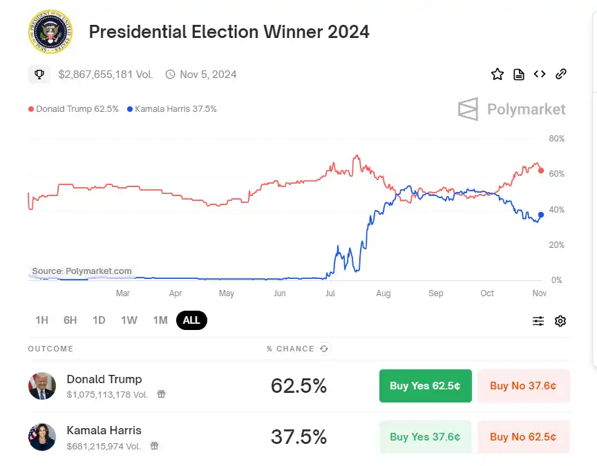 根据预测网站 Polymarket 的数据,特朗普胜选的概率目前为 62.5%,而哈里斯的胜算仅有 37.5%。尽管预测市场认为特朗普的胜率更高,但《福布斯》10 月 31 日的民调显示,哈里斯在全国范围内以 1% 的微弱优势领先特朗普,且 10% 的选民可能在大选前改变立场。