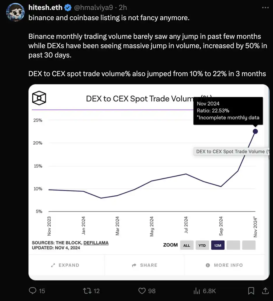 1.DEX 到 CEX 现货交易量百分比也在 3 个月内从 10% 跃升至 22%,@hmalviya9