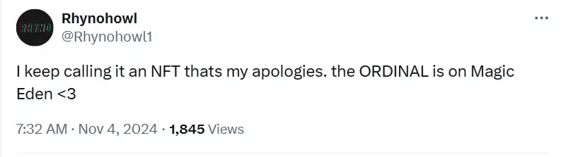 这也是在活动结束后,大家普遍认为 @Rhynohowl1 直接赚到了 1 BTC 的直接信源。实际上,@Rhynohowl1 在 Magic Eden 以 10 BTC 的价格上架了该铭文,目前收到的最高 offer 是 0.33 BTC。他会挂 10 BTC,很可能是因为 Casey 在回复中说了这么一句话: