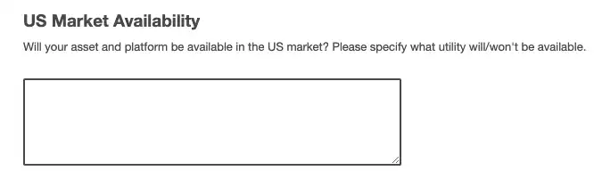 除去基本信息以外,问到的第一个问题就很有地方特色"你的资产和平台会在美国市场上销售吗?",毕竟作为合规交易所上来先得确保项目和美国本土用户的关系有多深。