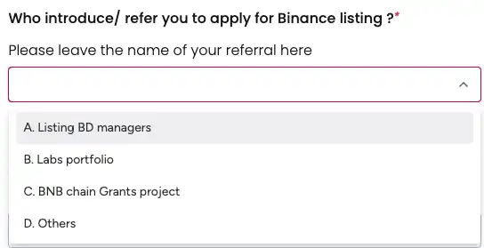 在填写包括项目名称、介绍等基本信息后,第一个内容就是选择是谁推荐你来在 Binance 申请 Listing 的?选项有四个,Listing BD 经理、Binance Labs 被投项目、BNB 链 Grant 项目、Others,总共 4 个选项 3 个都直接与 Binance 相关,选项的自上到下的顺序某种程度也可以说明优先级,所以确实意味着如果你能够「搞定」Binance,你确实就有机会搞定了 Binance。