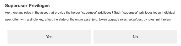 再往下的问题也很有意思,项目的资产中是否有给任何人设定超级用户的权限,即一个人可能会影响整个资产的状态,可见合规交易所在安全这方面也还是比较谨慎的,如果你选择了是的话,需要让你填写很多关于如何管理超级权限的内容,不过目前大部分项目都有超级权限这个东西吧,至少都是以多签形式存在的。