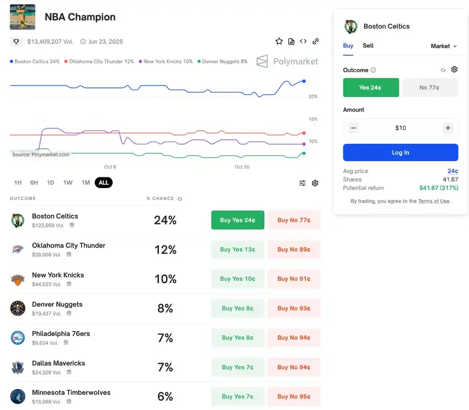 除了上述的二元市场,Polymarket 还提供了分类市场和标量市场。分类市场允许在多个选项上进行投注,每个选项根据结果被判定为$1 或$0。例如,一个预测 2025 年 NBA 总冠军的市场可能包括凯尔特人、雷霆、尼克斯和掘金等选项。