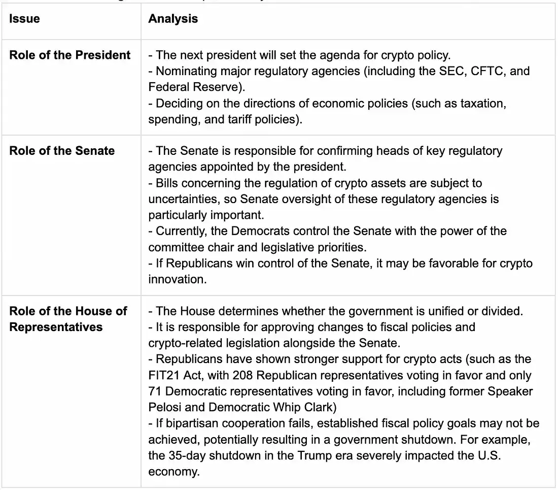 这种政治格局通常会导致政策僵局,因为总统和参议院必须在重大立法和任命上进行妥协。如果共和党全面胜利,他们可能会在三到六个月内出台新法律,这对加密货币市场来说是一个有利的结果,因为共和党通常主张为加密货币提供更宽松的监管框架。