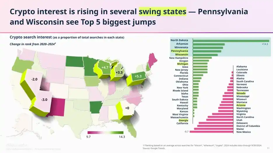 与此同时,摇摆州选民对加密货币的兴趣也显著上升。自 2020 年选举以来,预计将有激烈竞争的两大关键战场州——宾夕法尼亚州和威斯康星州,在 Google 上的加密货币搜索兴趣排名已跃升至第四和第五位。而密歇根州在这一指标上则排在第八位。
