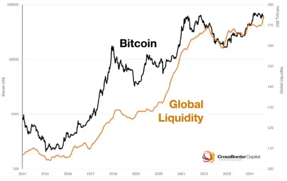 当美联储降息并且全球资本流动性显著上升时,比特币的价格往往会呈上升趋势,这表明宏观经济流动性仍然对加密货币市场有决定性影响。