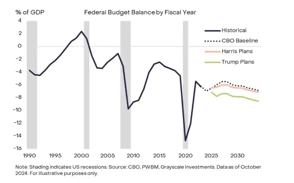 无论是特朗普还是哈里斯赢得总统选举,美国的财政政策都可能导致更大的预算赤字。国会预算办公室预测,在未来十年内,联邦预算赤字将占 GDP 的 6.2%。如果特朗普恢复 2017 年的减税政策并进一步降低税率,赤字可能会上升到 GDP 的 7.8%。相比之下,哈里斯计划将企业税率提高至 28%,但她的其他改革提案仍可能将赤字推高至 GDP 的 6.5%。