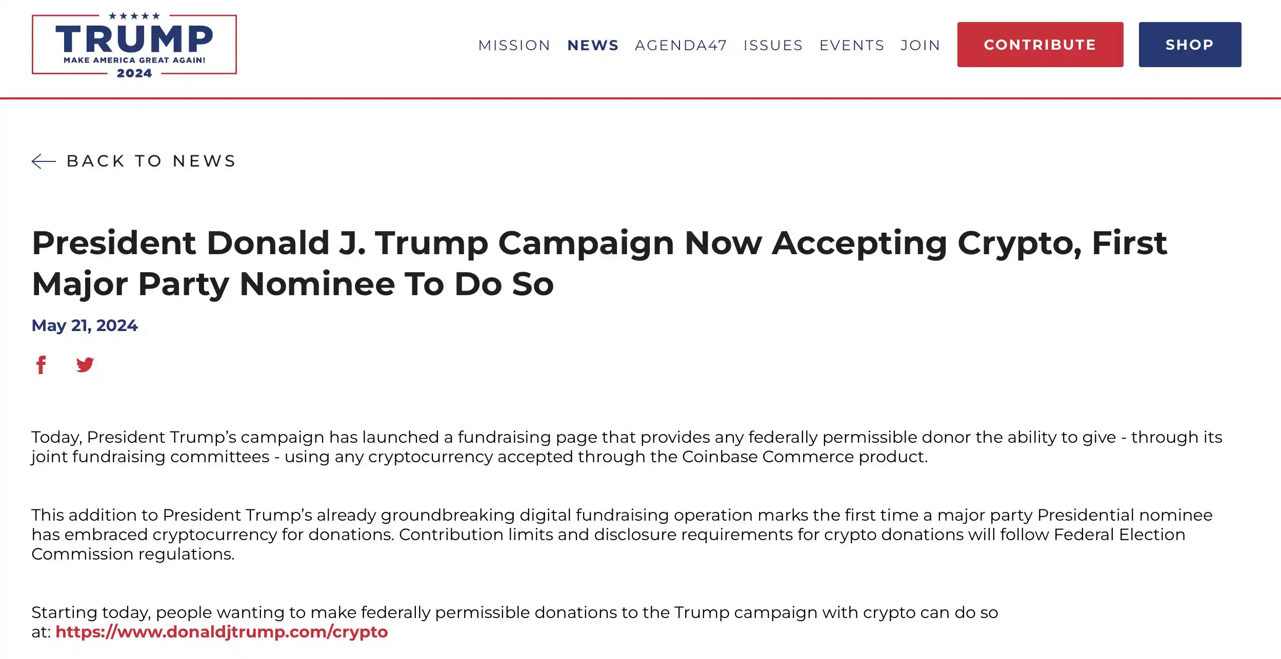 5 月 22 日,特朗普竞选团队在其官方网站上发布一则公告,表示其竞选活动将开始接受比特币捐款。特朗普的支持者可以使用 Coinbase Commerce 产品接受的任何加密货币为特朗普进行捐赠。