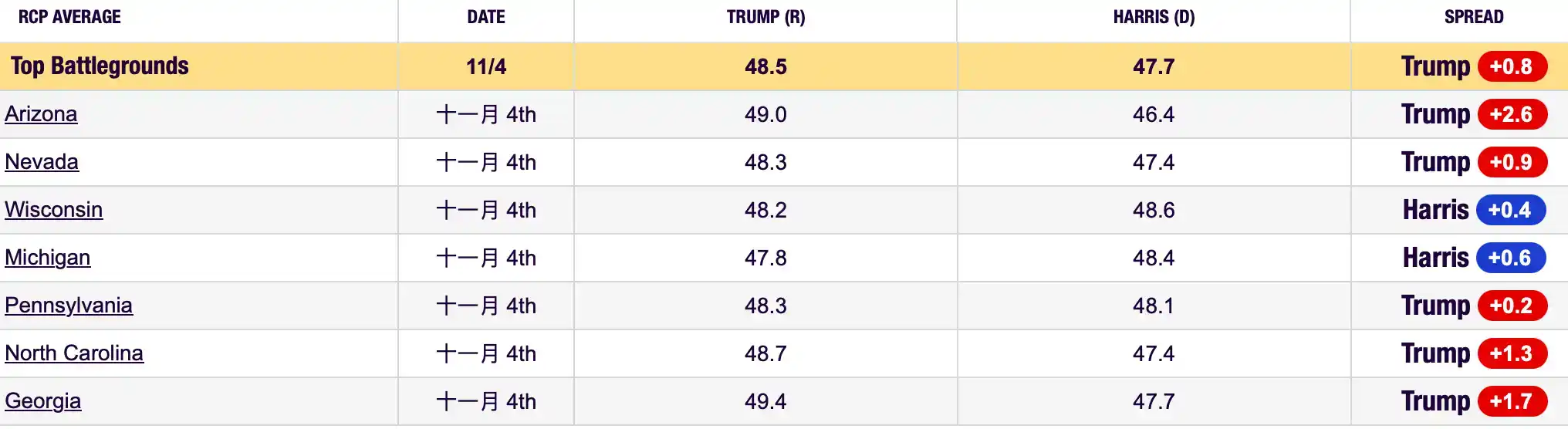 目前,哈里斯在威斯康辛州的领先优势进一步扩大,从 0.3 上升至 0.4,而在密歇根州的优势差距则从 0.9 下降至 0.6。另一边,特朗普在其余 5 州的领先优势,除亚利桑那和内华达两州外均有下降。