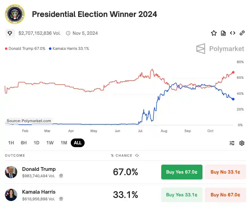 根据 Polymarket 的数据,在 10 月 30 日,该平台显示特朗普赢得 11 月 5 日总统选举的概率达到 67%。不过值得注意的是 Polymarket 不允许美国用户使用,因此这个胜率不一定能代表所有美国选民的意见。目前下赌注最大的用户是一个法国人,他分四个账号,下注 4,500 万美元押注特朗普赢得 11 月大选。