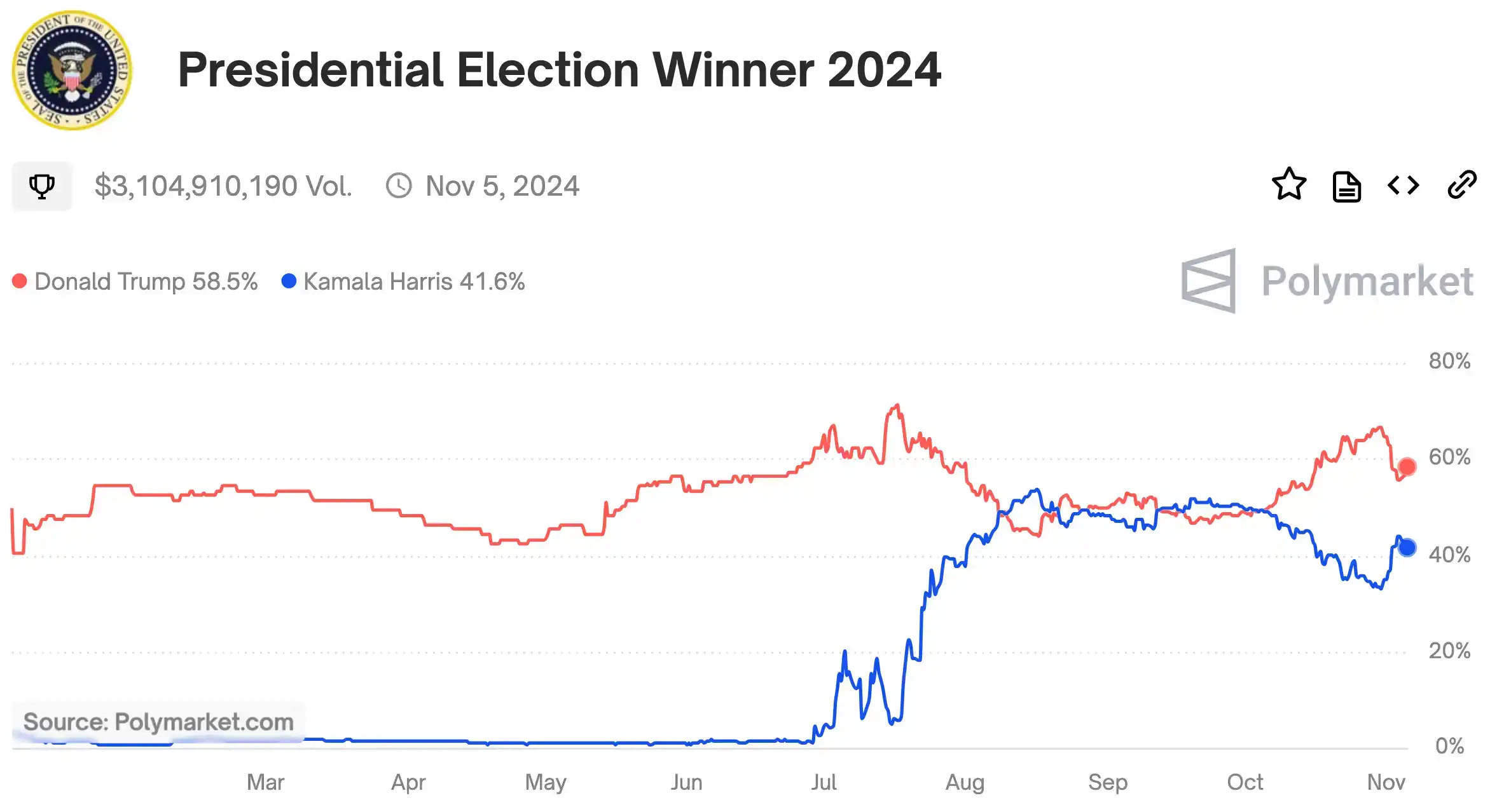 而截至 11 月 5 日,PolyMarket 的数据对大选结果给出的数据在今日进一步分化。目前,数据显示,特朗普胜率从昨日的 57.9% 上升至 58.5%。
