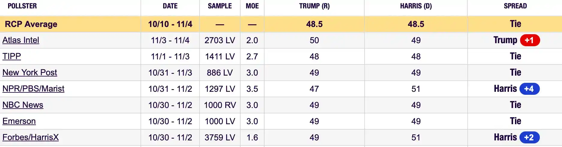 副总统哈里斯在最新的民调数据中的反超趋势进一步强化,分别在 PBS 新闻 Marist、福布斯新闻 HarrisX 等媒体平台的民调数据中以 51:47 和 51:49 的优势领先特朗普,而二人在 NBC 新闻、纽约邮报等平台仍以 49:49 持平,局势发展仍待今日进一步观察。