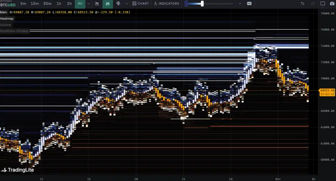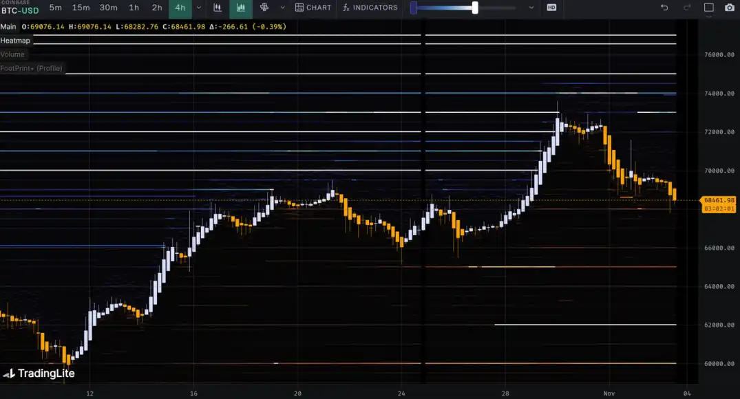 本周从 10⽉28⽇到 11⽉4⽇,冰糖橙最⾼附近$73620,最低接近$67864,震荡幅度达到 7.82% 左右。观察筹码分布图,在约 65000 附近有⼤量筹码成交,将有⼀定的⽀撑或压⼒。