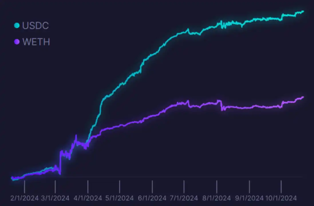 ETH-USDC 流动性池:自推出以来,USDC 的年化收益率为 14.6%,ETH 的年化收益率为 7.0%