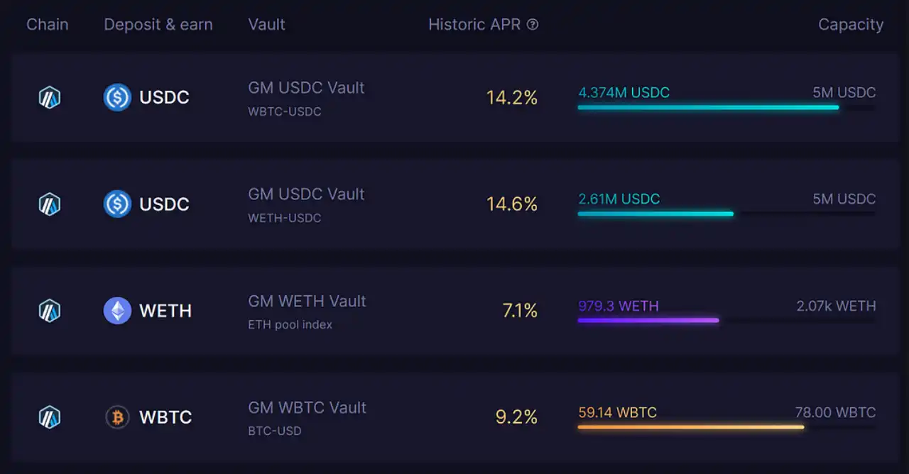 在去中心化金融领域,收益表现至关重要,而 Umami Finance 的 GM Vaults 一直都设立了高收益单边产品的标杆。自推出以来,这些 GM Vaults 持续为用户带来高额实际收益,目前的历史年收益率(APR)如下: