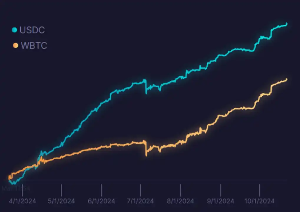 BTC-USDC 流动性池:自推出以来,USDC 的年化收益率为 14.2%,BTC 的年化收益率为 9.2%