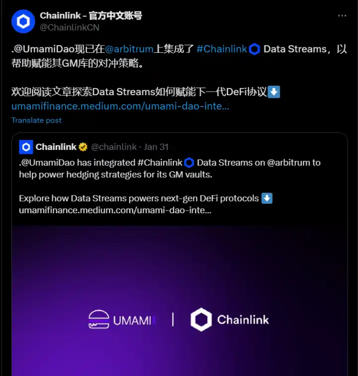 Umami 的 GM Vaults 还利用 Chainlink 的数据流进行低延迟验证费用,确保最佳的价格执行。Chainlink 数据流提供了用户存款安全的信心,进一步增强了我们对优质安全的承诺。