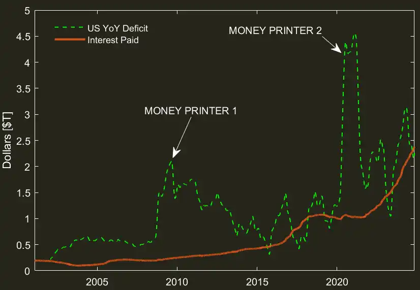 为了简洁明了,我设计了一张图表来最直观地阐述我的观点。图中展示了美国年度赤字增长率和现有国债支付的总利息(数据直接来自财政部网站)。请注意,在 2008 年之前,美国债务占 GDP 的比重维持在 40-60%,这意味着私营部门(银行)相对公共部门而言可以大量增发货币,且资金可用于购买新债务,而无需担心投资组合中国债比例过高。事实上,发行国债以供市场持有高质量资产是有利的。