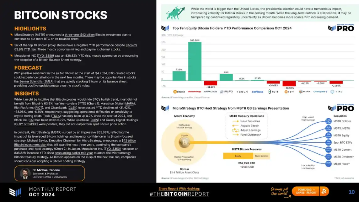 · 尽管比特币今年迄今上涨 63.9%,但前十大比特币相关股票中有六只表现不佳(负收益)。