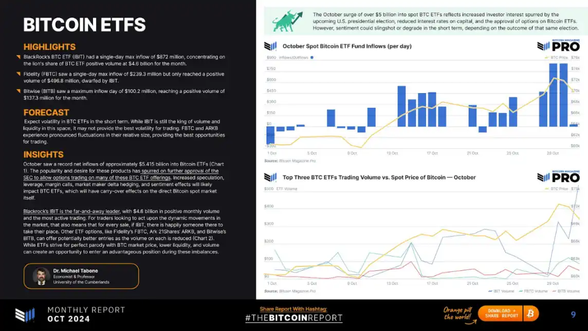 · 比特币 ETF 激增:10 月份 ETF 流入量超 54 亿美元,贝莱德的 IBIT 领先市场。这反映了比特币在主流金融市场中的接受度不断提高。