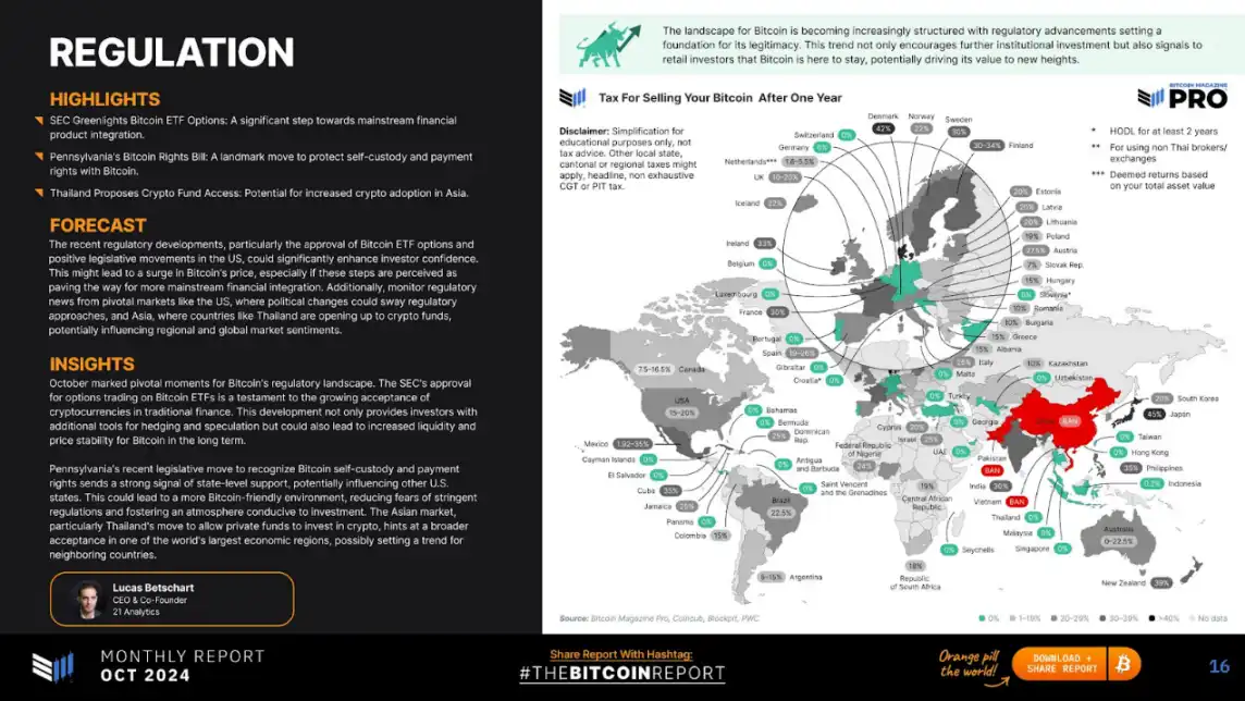 10 月是比特币监管格局的关键时刻,SEC 批准比特币 ETF 期权交易证明了传统金融对加密货币的接受度越来越高。这一发展不仅为投资者提供了额外的对冲和投机工具,而且从长远来看,还可能提高比特币的流动性和价格稳定性。