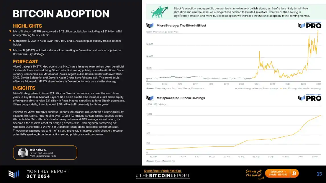 受 MicroStrategy 成功的启发,日本的 Metaplanet 也在今年春天采用了比特币储备策略,目前持有超过 1,000 个 BTC,成为亚洲最大的公开交易比特币持有者,由于比特币的通缩性质和 40% 的平均年回报率,其已成为对冲过剩现金的首选储备资产,甚至大型科技公司也开始效仿:微软股东将在 12 月投票决定是否采用比特币作为储备资产。尽管管理层表示「拒绝」,但强烈的股东兴趣可能会改变决定,从而可能引发上市公司更广泛地采用比特币。