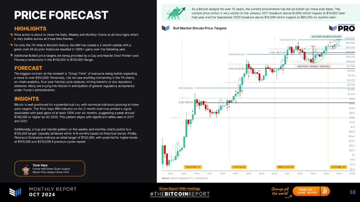 比特币为潜在的牛市做好了准备,技术指标指向了三个价格目标。2 个月图表上的 Tone Vays MRl 指标显示,过去 6 个月的涨幅至少为 100%,表明到 2025 年第二季度将达到约 14 万美元或更高的峰值。这种模式与 2017 年和 2021 年的大幅反弹一致。