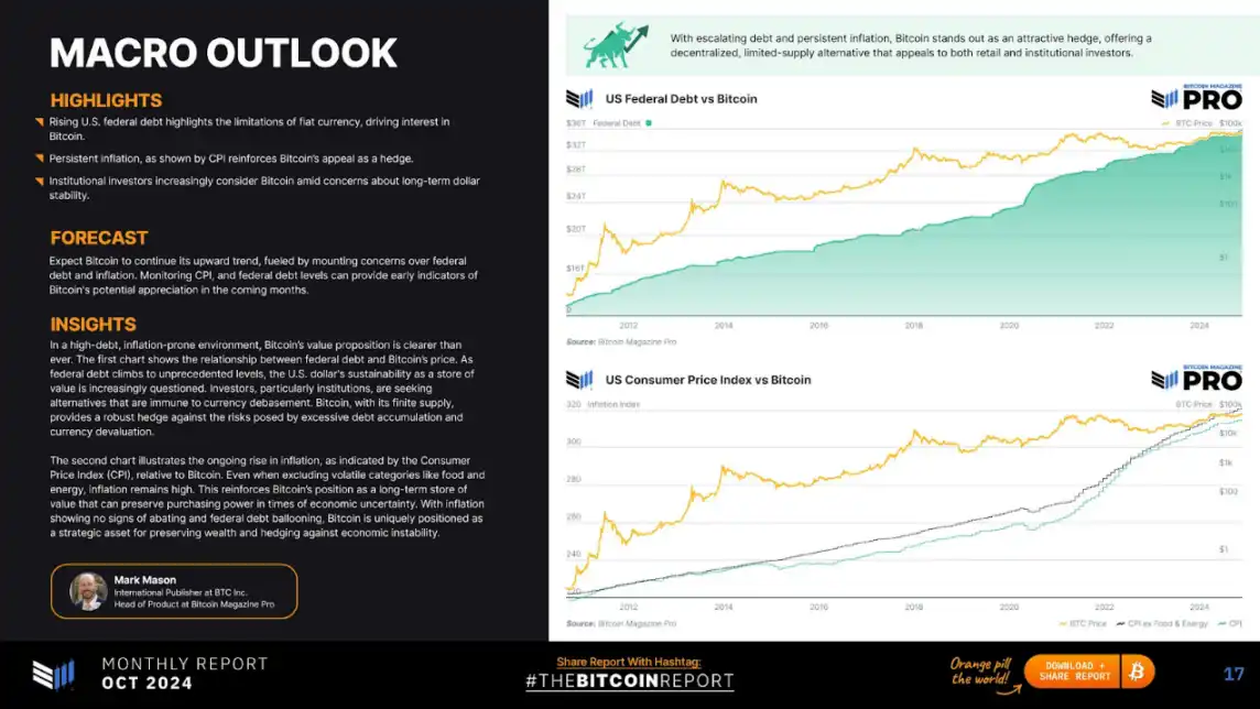 美国联邦债务不断上升凸显了法定货币的局限性,推动了人们对比特币的兴趣。CPl 显示的持续通胀增强了比特币作为对冲工具的吸引力。在对美元长期稳定性的担忧中,机构投资者越来越多地考虑比特币。