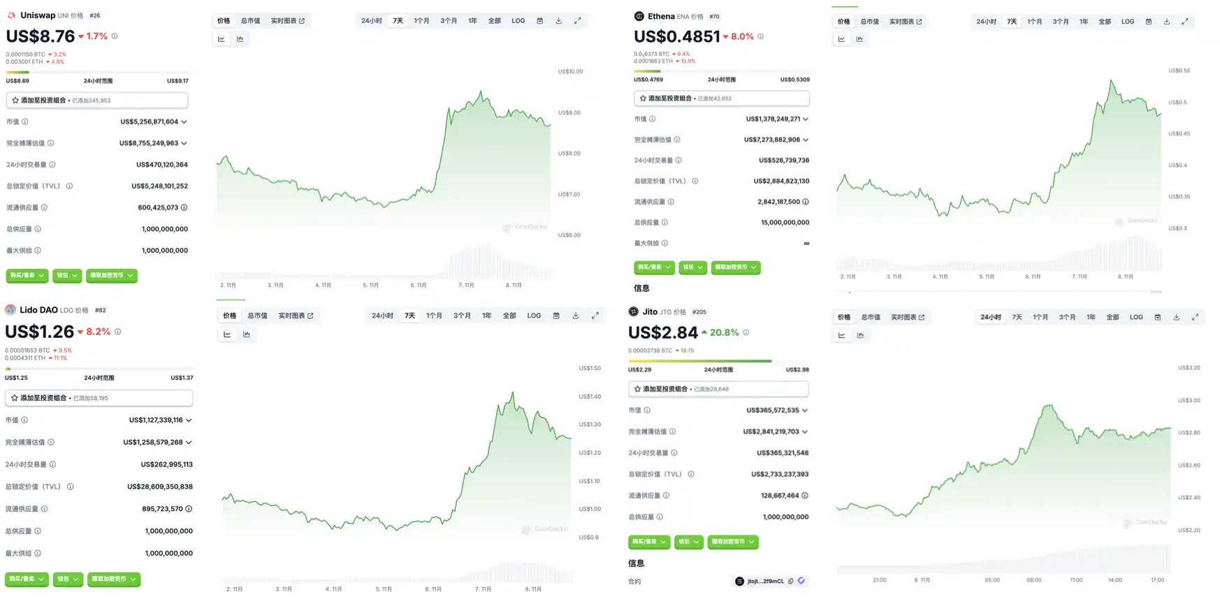 这些 DeFi 代币在 Trump 当选都收获了不错的涨幅,Uniswap 最大收获了 46% 的涨幅,Ethena 最大收获了 72% 的涨幅,Jito 最大收获了 63% 的涨幅,Lido DAO 最大收获了 56% 的涨幅,截至发文时有少许回落。