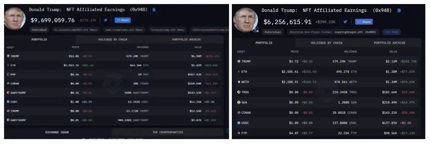 从 Trump 系列的 meme 币发行以来的表现来看,以 Trump 为例,在 Trump 竞选的前夕,价格已经处于相对的低位。很有趣的一点是,当我们观察 Trump 目前已经公布的账户来看,五月份至今,Trump 的加密地址账户所属了三百多万美元,主要的亏损来自于 Trump 同名 meme 币,数量并没有减少,但是随着价格的缩水,Trump 地址的资产也大幅缩水。