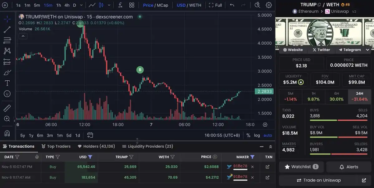 在 Trump 竞选成功后,当然有「利好散尽」的预期,但是以 Trump 同名代币为例,他并没有明显的涨幅后就出现了「腰斩」,这显然是不符合常理的。