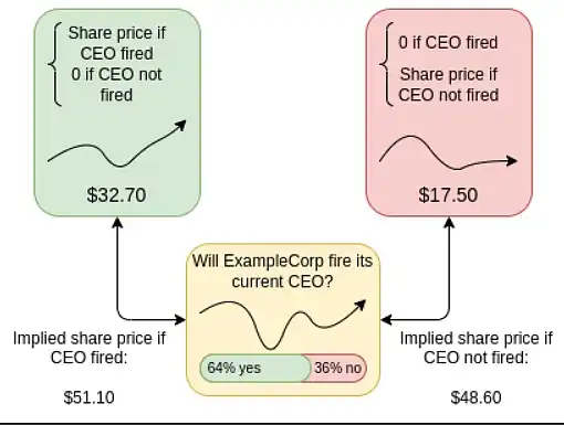 预测市场就是一个例子:你想知道未来会发生的某个具体事实,所以你设立了一个市场让人们押注这个事实。另一个例子是决策市场:你想知道根据某个指标 M,决策 A 和决策 B 哪个会产生更好的结果。为了实现这一点,你设立了条件市场:你要求人们押注 (i) 会选择哪个决策,(ii) 如果选择决策 A,则 得到 M 的值,否则为零,(iii) 如果选择决策 B,则得到 M 的值,否则为零。有了这三个变量,你就可以确定市场是否认为决策 A 或决策 B 对得到 M 的值更有利。