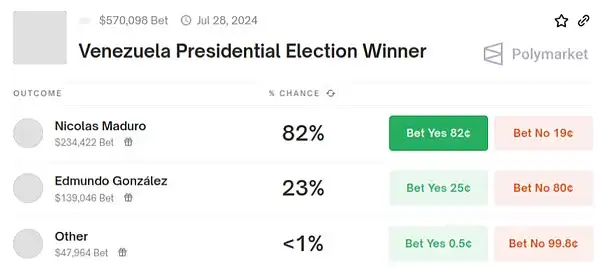 但对我来说,这甚至不是 Polymarket 有趣的最佳例子。所以让我们来看另一个例子:7 月份委内瑞拉的选举。选举结束后的第二天,我记得眼角余光看到有人在抗议委内瑞拉被高度操纵的选举结果。起初,我没怎么在意。我知道马杜罗已经是那些「基本上是独裁者」的人物之一,所以我想,他当然会伪造每一次选举结果以保住自己的权力,当然会有人抗议,当然抗议会失败——不幸的是,许多其他人都失败了。但后来我在 Polymarket 上滚动浏览时,看到了这个:
