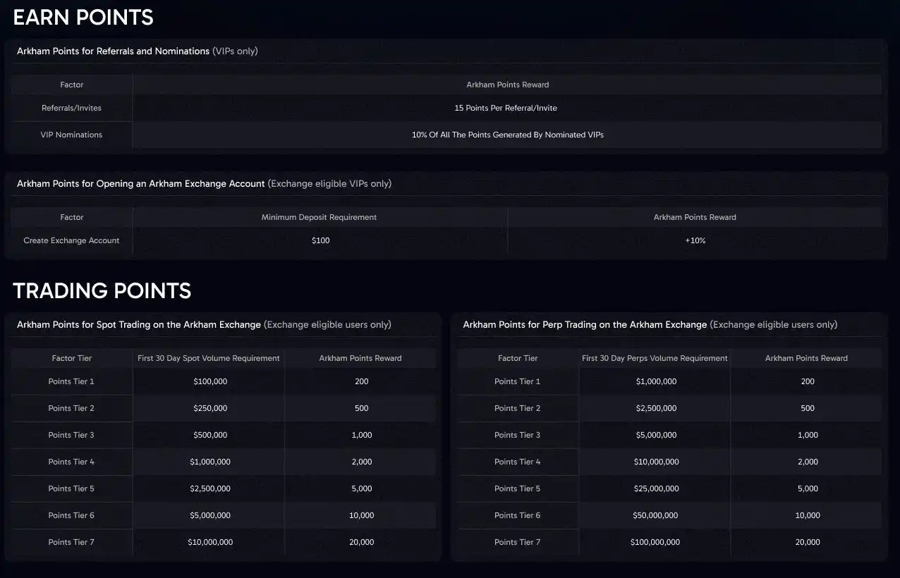 Arkham perpetuals exchange 将对用户提供 0 手续费的挂单现货和合约交易(即 Maker),对于市价交易(即 Taker)的用户而言则会根据其持有的$ARKM 和交易量来确定手续费减免。如果用户选择使用 ARKM 支付手续费那么还会获得 25% 的手续费折扣。用户可以通过在 Arkham perpetuals exchange 上进行交易从而获得积分。VIP 用户开设账户的话可以将总积分提升 10%,同时在 Arkham Intel exchange 的积分依然有效。