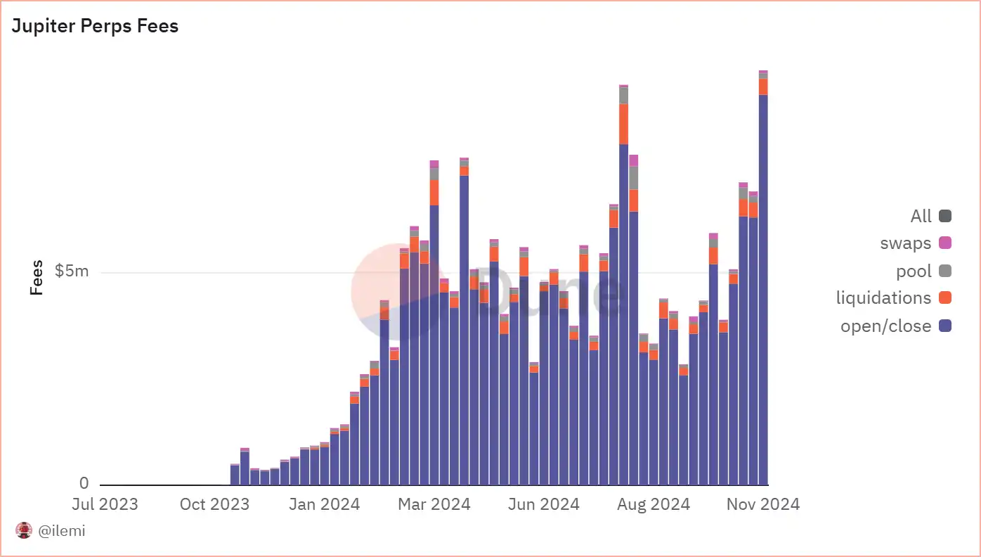 Jupiter 作为 Solana 上龙头的 DEX 聚合器,天然的继承了 Solana 上泼天的流量。Jupiter 将在 Solana 上所有主要 DEX 和 AMM 中找到最优惠的价格路线,能够最大程度地减少滑点和交易费用,为用户提高交易效率。虽然 Jupiter 提供例如现货交易、DCA 定投、限价单交易多种功能,但是最受欢迎的还是 Perp 交易。其中 Jupiter 的永续合约交易撑起了其费用收入的半边天。