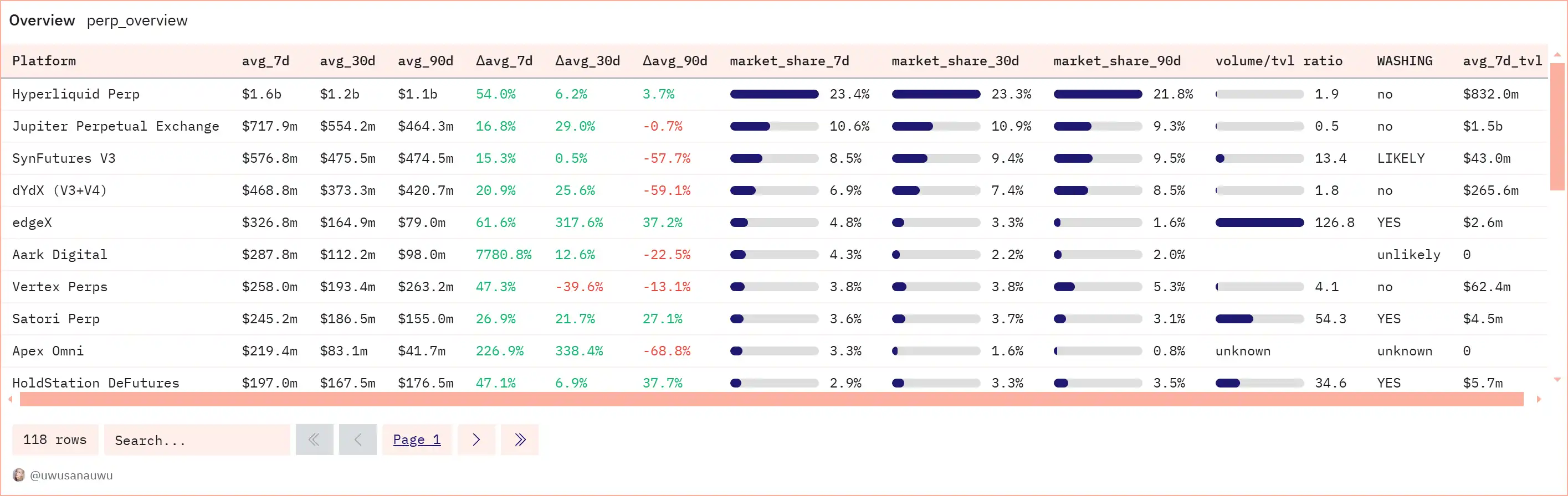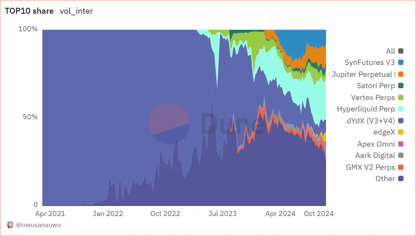 目前的 Perp DEX 赛道似乎快和以太坊 L2 一样拥挤。除了大家熟知的龙头项目如 dydx、Hperliquid、Jupiter 等,还有十来余家勉强维持生命体征的 Perp DEX。由于流动性的缺失,如今基本沦为了投机者的套利工具。笔者将按市场份额的顺序逐一分析。