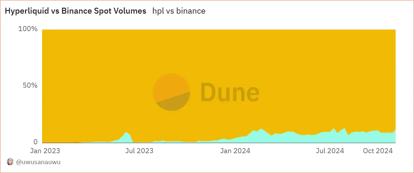 虽然 Perp DEX 也在产品上变着花样的卷,不仅在产品上有 spot、lending、bet、per-lauch,从流动性的设计上来看还有 orderbook 和 auction,甚至开始在 UI 和 meme 上下功夫。然而 perp dex 并不是那么一帆风顺,强如龙头 Hyperliquid 也难以和Binance抗衡。根据 Dune 数据显示,Hyperliquid 交易量仅占Binance现货交易量的 1/9。