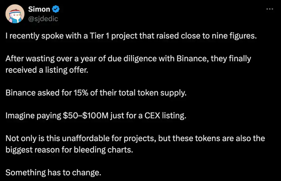 另一方面,CEX 不仅上币慢、在不同地区会限制交易,最重要的是上架了一系列筹码结构严重不公平的「VC 币」。就在前一阵,加密货币投资咨询公司 Moonrock Capital 的首席执行官在推特发声,声称:「Binance 要求某个潜在项目提供其总代币供应量的 15% 以确保其在中心化的交易所上市,而这占到了代币总供应量的 15%,价值约 5000 万到 1 亿美元。」于是各大 KOL 在推特展开了上币费的讨论。
