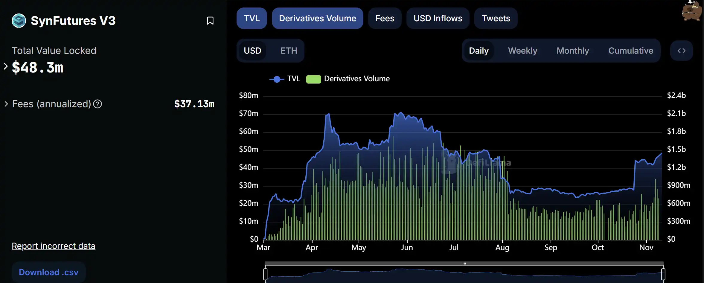 SynFutures 最初部署在以太坊的 Layer2 Blast 上,但是随着 Blast 因其过于膨胀的「拼多多」积分导致的社区差评和生态大面积流失,在今年 7 月 SynFutures「搬家」至 Base 链上。目前,SynFutures 已经成为了 Base 上最大的链上衍生品交易平台。随着比特币突破 8 万美金,市场逐渐复苏。SynFutures V3 的交易量和 TVL 也开始冲击新高。