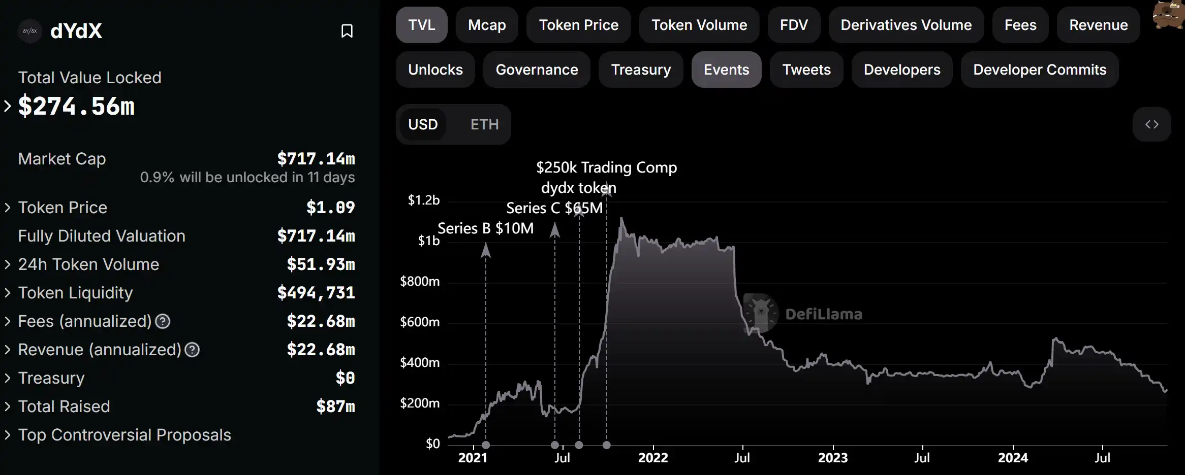 dydx 作为 Perp DEX 中的最先跑出来的项目,其 TVL 在 2022 年达到巅峰接近 12 亿美元。但是在市场进入深熊后便一蹶不振,即使在 2024 的小牛中期也没有回光返照。甚至在近期链上行情如此火热的情况下,其 TVL 依然在不断流失。仅在宣布做 pump 时,代币 DYDX 上涨 20% 才勉强吃到了这一波的 meme 红利。10 月 10 日,dydx 创始人 Antonio Juliano 宣布回归并重新担任 dyadx CEO 一职,随后便是裁员整改。市场也期待创始人的回归和改革,可以带领 dydx 走出当前的困境。