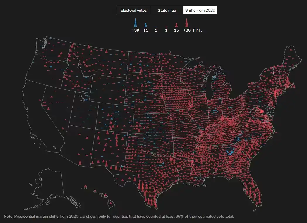 下图为彭博社制作的热力图,显示每个县的 95% 以上投票结果,并对比 2020 年与 2024 年两党总统候选人的支持率变化,红色区域显著增加。