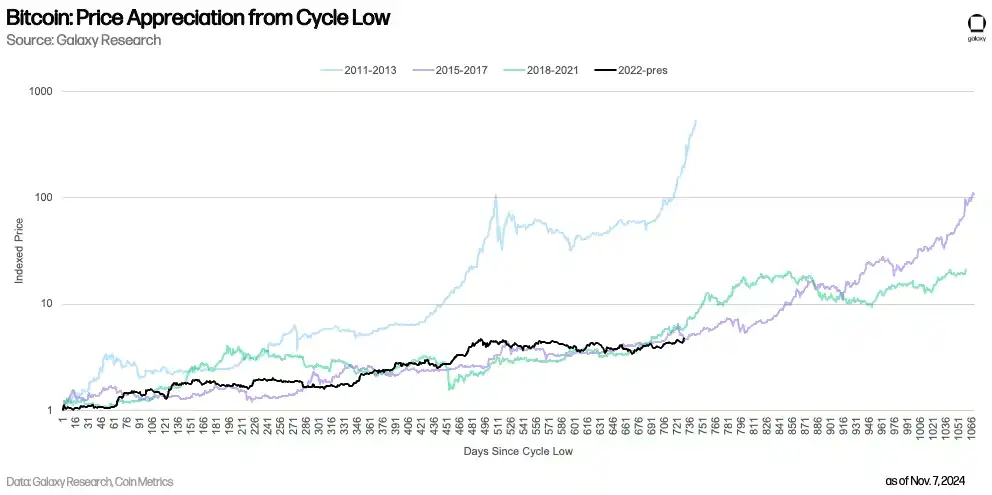 回顾历史,比特币当前的走势与前两次牛市基本一致。从历次周期低点(2011 年:2 美元,2015 年:152 美元,2018 年:3122 美元,2022 年:15460 美元)来看,比特币的走势与 2017 年牛市保持同步,且仅略微落后于 2021 年牛市的步伐。