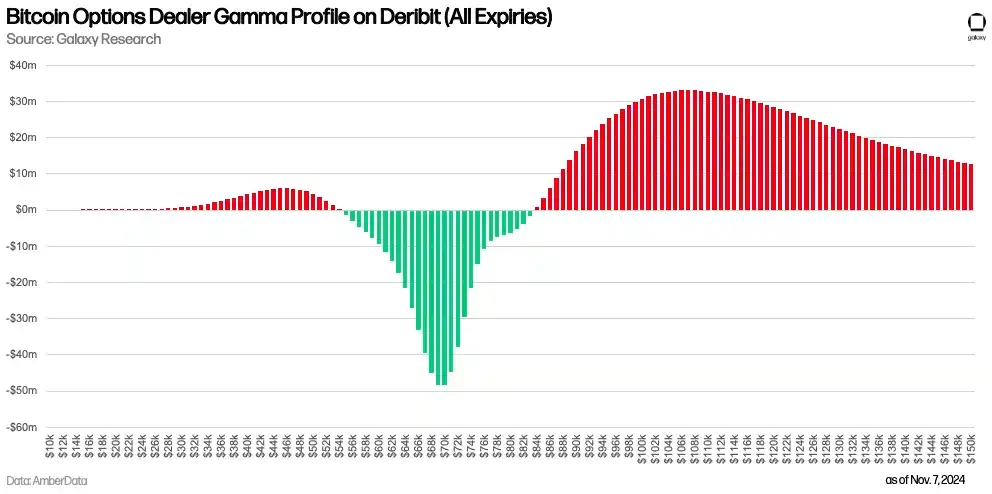 比特币期权交易商在 54,000 美元到 84,000 美元之间持有净空 gamma 头寸,这将加剧任何价格波动。简单来说,当交易商持有空 gamma 头寸时,他们通常会在价格上涨时通过买入现货来对冲,或者在价格下跌时通过卖出现货来对冲。