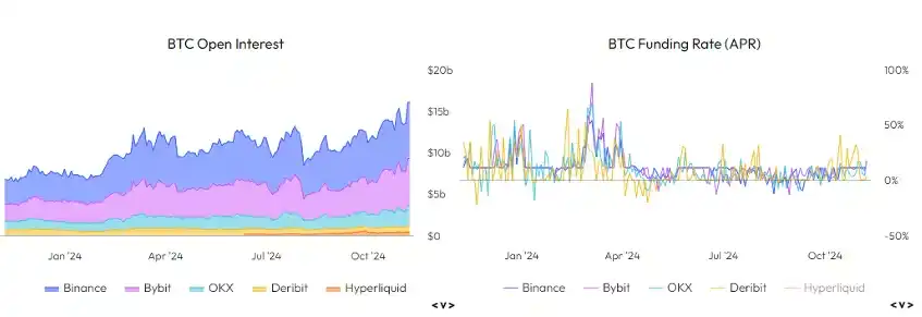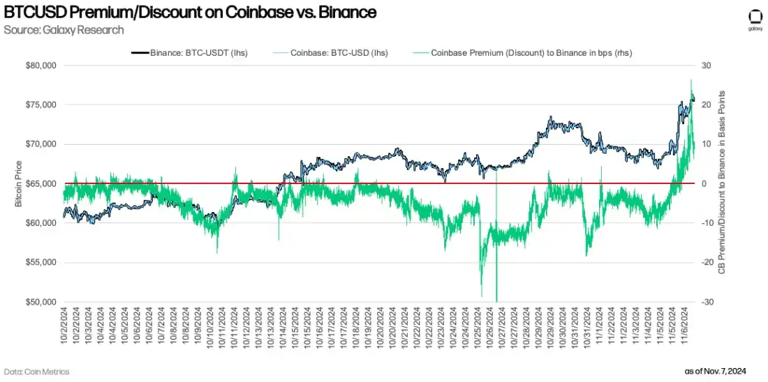 尽管市场波动较大——自周一以来上涨了 15%,自 10 月 1 日以来上涨了 26%——但从基本面来看,市场并未显现过热迹象。在比特币因选举消息上涨的同时,「Coinbase 溢价」于周二晚间显著回升,且至少一个月来首次转为正值。
