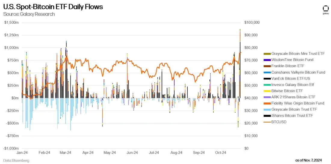 比特币 ETF 表现强劲,11 月 7 日(周四)创下历史最大净流入,吸引了高达 13.75 亿美元资金,推动比特币再创新高。这一数据打破了此前 2024 年 3 月 12 日创下的 10 亿美元净流入记录。