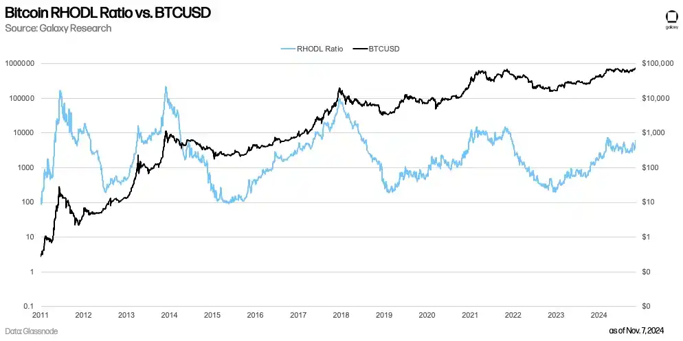 较高的比率通常表明市场过热,且峰值往往与市场顶部一致。2024 年 RHODL 的横盘走势更类似于 2019-2020 年的横盘阶段,而非任何市场顶部活动,这表明近期和中期内比特币仍有上涨空间。