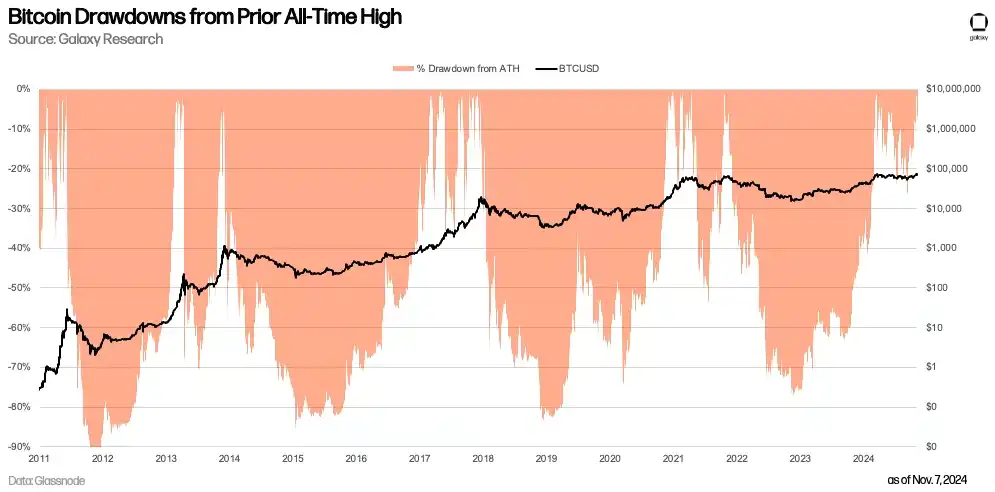 11 月 4 日星期一,比特币最低跌至 66,700 美元,但自那以来上涨了 15%,创下历史新高。11 月 5 日,随着特朗普胜选概率增加,比特币迅速攀升至新的历史高点,并在 75,000-76,000 美元区间徘徊。