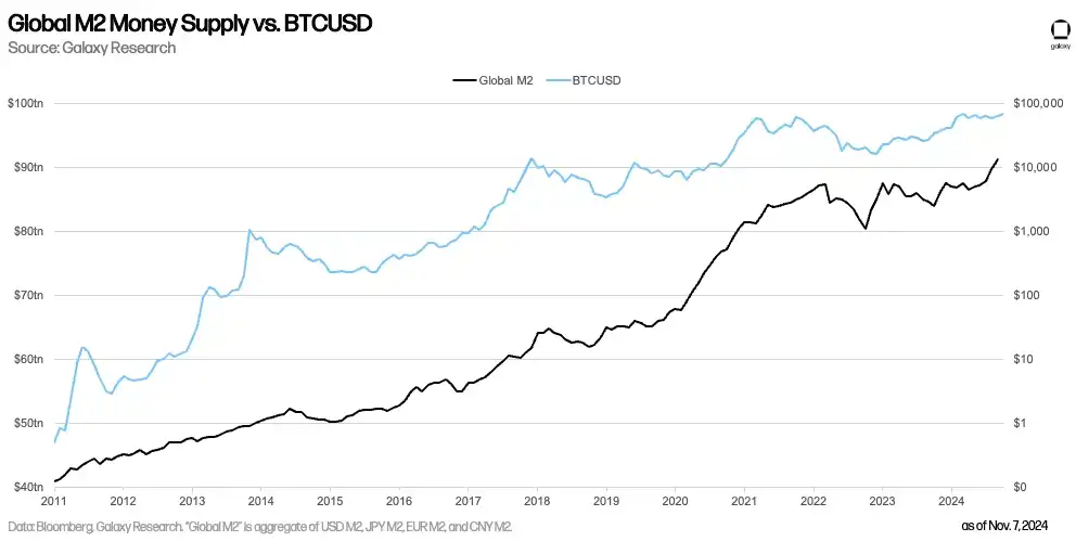 比特币历史上对全球货币供应量的变化有所反应。虽然这种关联并非比特币独有,但仍值得关注,特别是如果比特币开始更多地作为对冲资产使用,正如 Larry Fink 所提到的那样。