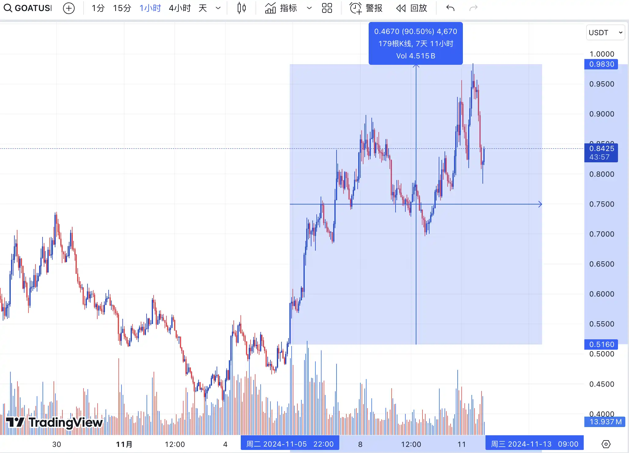 GOAT 全称叫做 goatseus maximus,是 truth_terminal(曾被 a16z 创始人 Marc Andreessen 投资价值五万美元的比特币的 AI Bot)自言自语想出来的。作为 AI meme 的龙头,背后有许多传奇交易员支持,例如 Eugene 鸽子、Nachi,在上线币安有些许的回落之后,迅速 V 反。从加密市场对 Trump 竞选活动产生反应,即 11 月 5 日的美盘时间以来,最高上涨 90.5%,市值现报 8.4 亿美元。